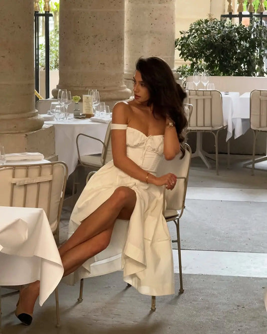 Elegant White Corset Midi Dress – A-line Cotton Summer Dress with Lace-Up Back