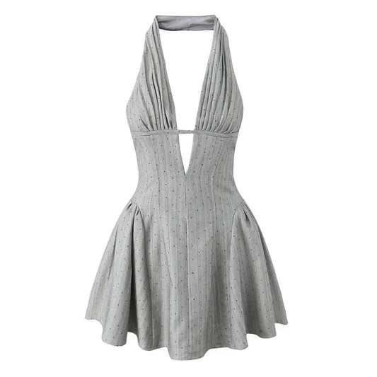 Gray Halter Neck Mini Dress – Sexy V-Neck Backless Party Dress for Women