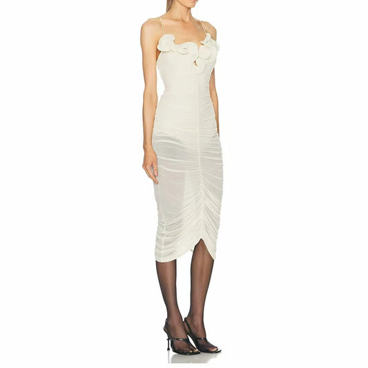 Elegant White & Black Ruched Midi Dress – Backless Slim Fit Summer Party Dress