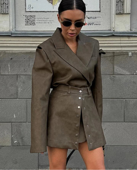 Khaki Blazer and Mini Skirt Set for Women – Elegant Two-Piece Outfit with Long Sleeve Jacket | Office & Party Wear