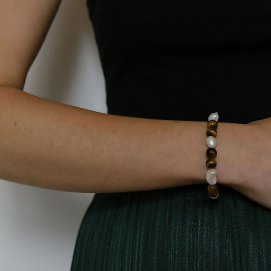 It Is Baroque Freshwater Pearl Beaded Tigers Eye Elastic Bracelet