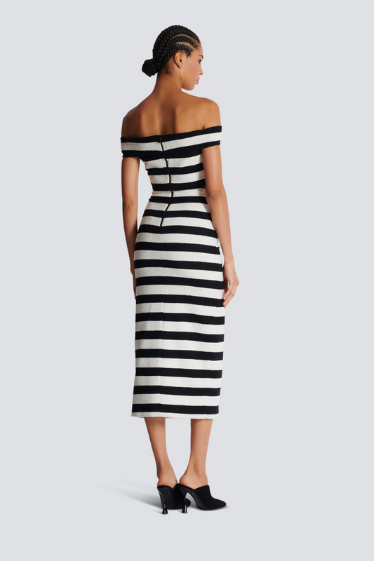 Alizey Off Shoulder Slit Striped Buttoned Skirt Set