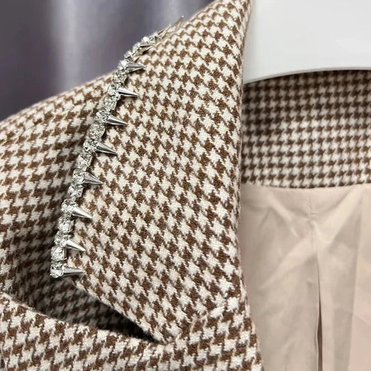 NOTCHED COLLAR LONG SLEEVE SPLICED DIAMONDS COAT and HIGH WAISTED MINI SKIRT