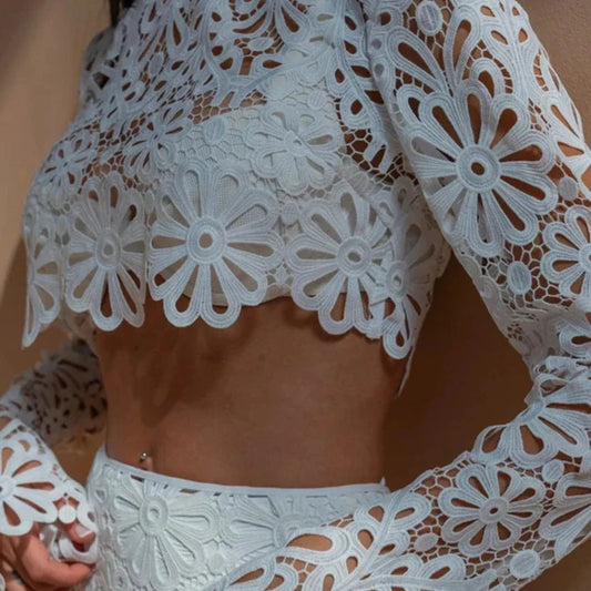 WHITE EMBROIDERED MINI SKIRT and HALTER CROP TOP 2 PEACE SET