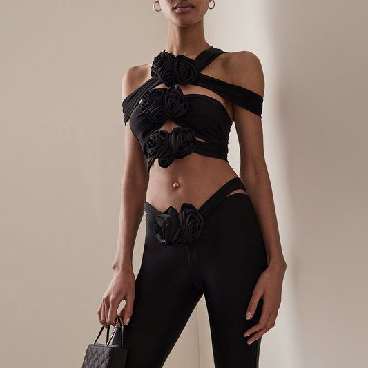 HANAE BLACK CUT OUT TOP and FLARED PANTS with ROSE BOWS SET