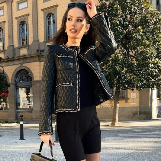 Biker Winter Metallic Chain Trim Long Sleeve Vegan Leather Quilted Jacket