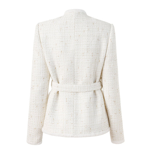 Classy Faux Fur Trim Mock Neck Button Up Lurex Stitch Belted Tweed Jacket
