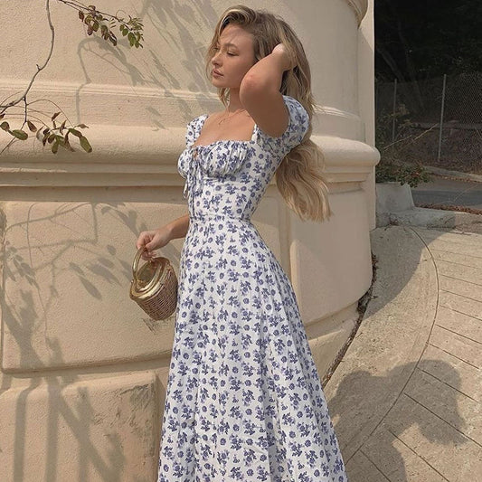 Square Neck Tie Front High Slit Puff Sleeve Midi Floral Dress - Blue