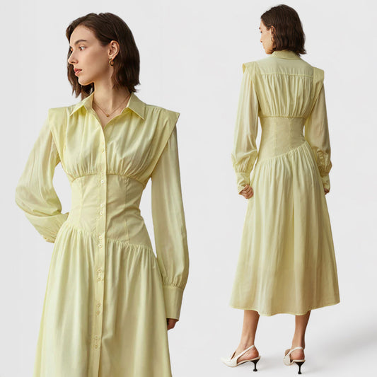 BUTTONED LONG SLEEVE MIDI DRESS - Yellow