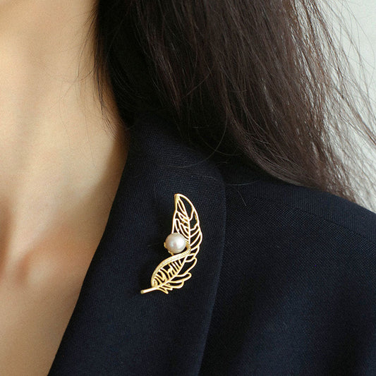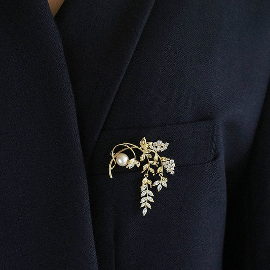 ART NOUVEAU 18K Gold Plated Cubic Zirconia Leaf Freshwater Pearl Brooch