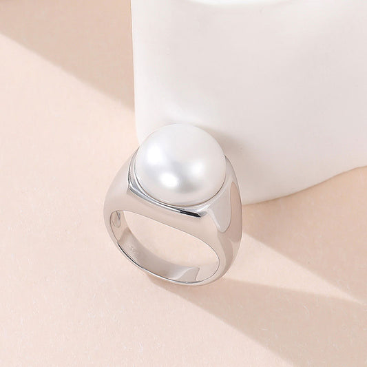 Rhodium Plated Sterling Silver Bezel Set Sphere Freshwater Pearl Dome Ring