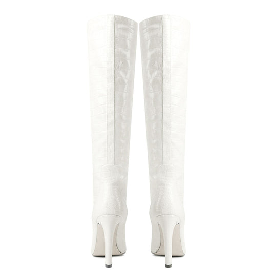 Chic Croc Effect Faux Leather Pointed Toe Knee High Stiletto Boots - Off White