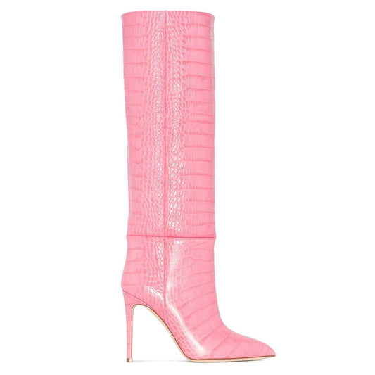 Classy Crocodile Effect Pointed Toe Knee High Stiletto Boots - Pink