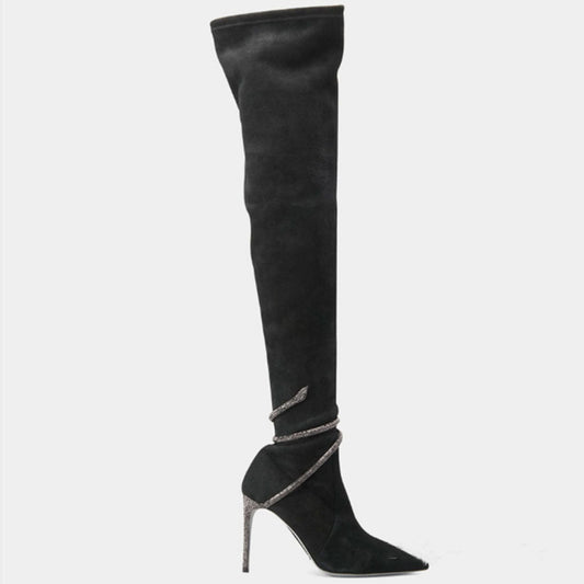 Crystal Snake Embellished Pointed Toe Over Knee Suede Boots - Black