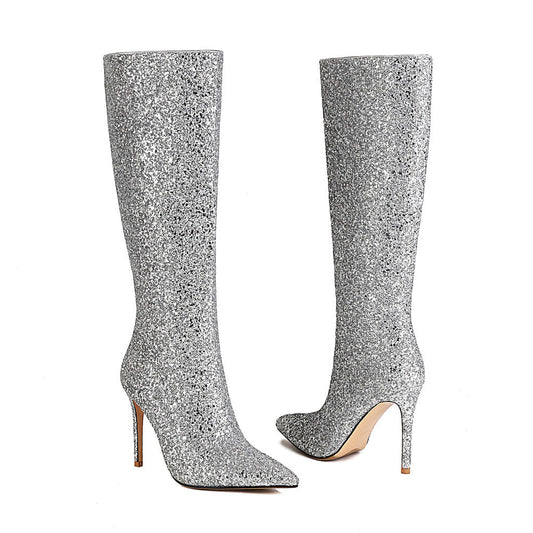 Luxury Glitter Pointed Toe Stiletto Heel Knee High Boots - Silver