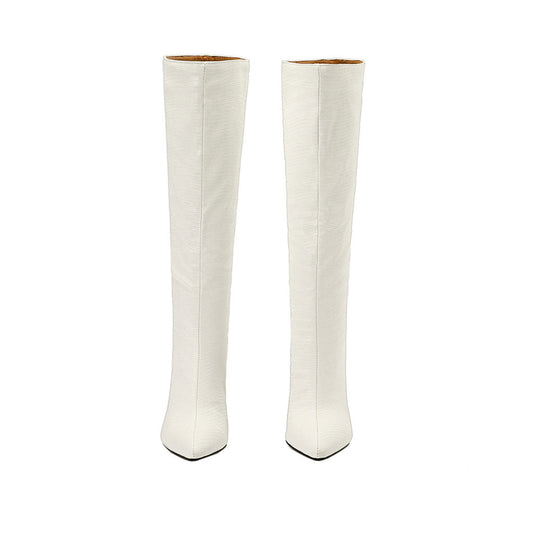 Snake Effect Leather Pointed Toe Knee High Stiletto Boots - Off White