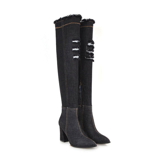 Stylish Distressed Denim Over Knee Pointed Toe Block Heel Boots - Black