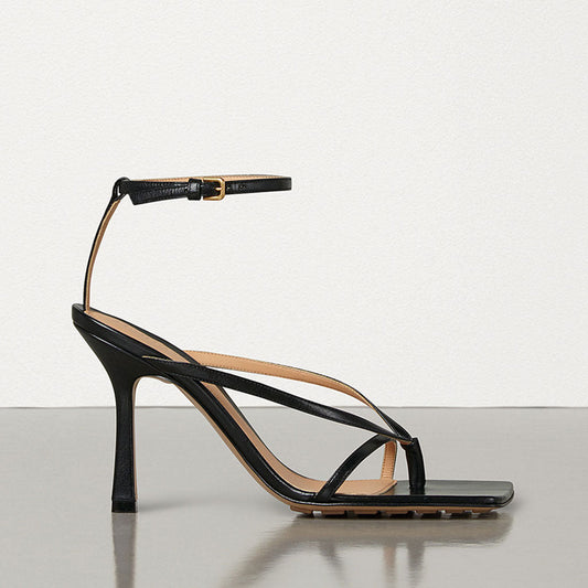 Seductive Thong Strap Faux Leather Square Toe Stiletto Sandals - Black
