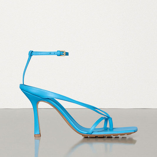 Seductive Thong Strap Faux Leather Square Toe Stiletto Sandals - Sky Blue