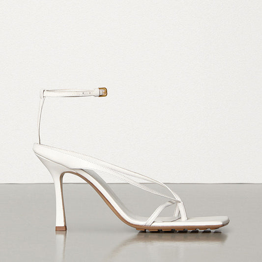 Seductive Thong Strap Faux Leather Square Toe Stiletto Sandals - White