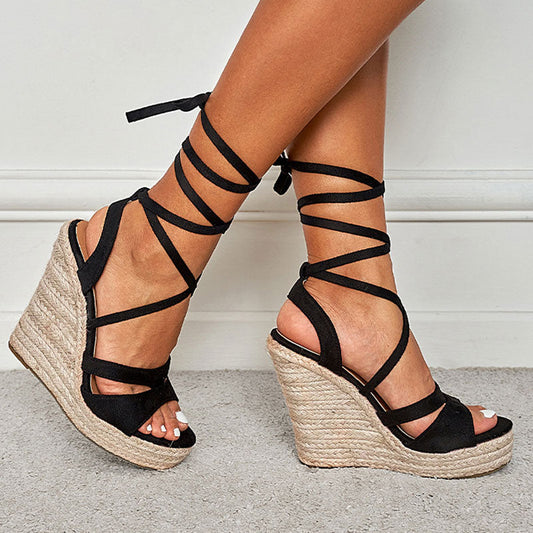 Sexy Open Toe Strappy Suede Lace Up Ankle Tie Wedge Espadrilles - Black