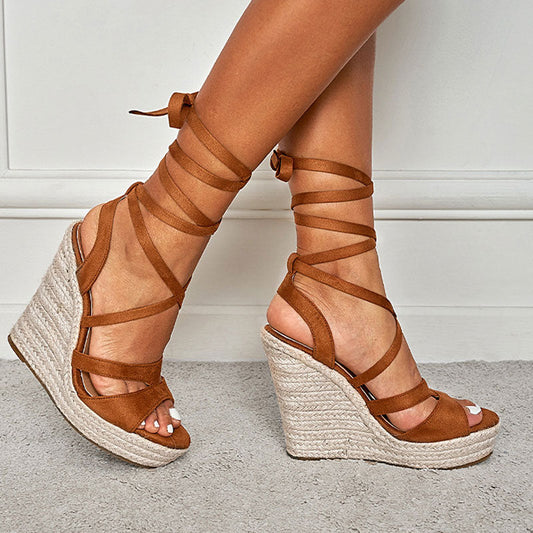 Sexy Open Toe Strappy Suede Lace Up Ankle Tie Wedge Espadrilles - Brown