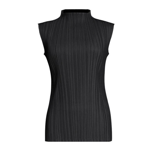 Comfy Solid Color Mock Neck Slim Fit Pleated Sleeveless Top