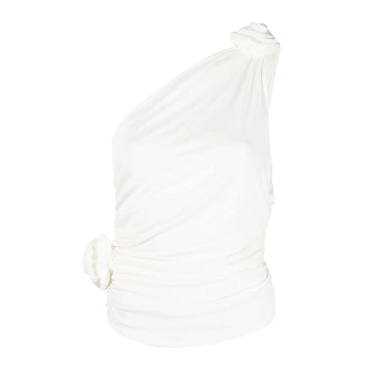 Elegant 3D Floral Rosette Detail One Shoulder Ruched Sleeveless Top