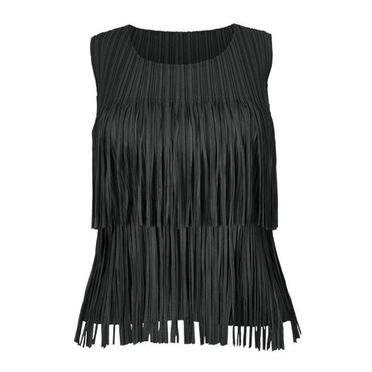 Playful Tiered Fringed Round Neck Monochrome Pleated Sleeveless Top