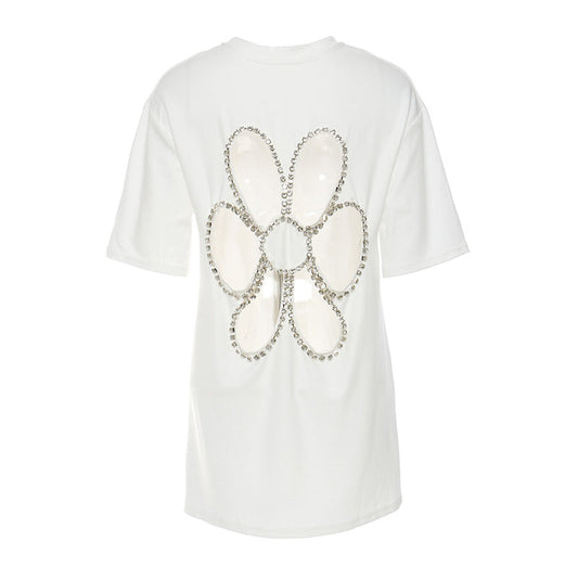 Stylish Crystal Embellished Floral Cutout Short Sleeve Relaxed T Shirt