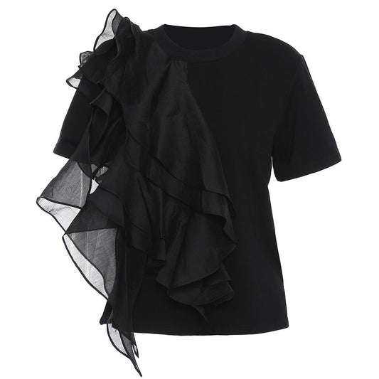 Unique Tiered Ruffle Detail Round Neck Short Sleeve Cotton Blend Top