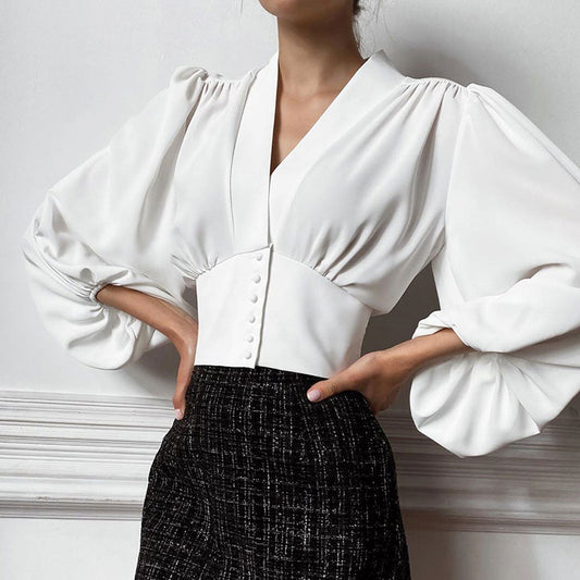 Elegant Solid Ruched Lantern Sleeve V Neck Button Up Cropped Chiffon Blouse