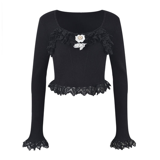 Cute Bow Trim Scoop Neck Lace Detail Long Sleeve Cropped Rib Knit Top