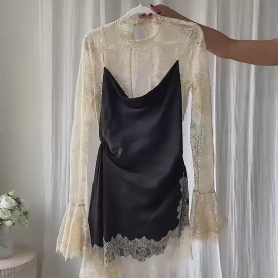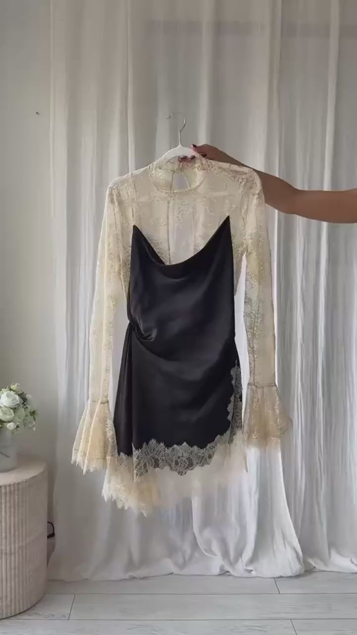 Elegant lace patchwork mini dress for women featuring a sheer lace overlay, fitted waist cinching silhouette, and feminine flared sleeve design. This sexy short women’s dress combines contrast lace and smooth fabric panels to create a refined yet bold look ideal for club nights, parties, evening events, and statement fashion styling.