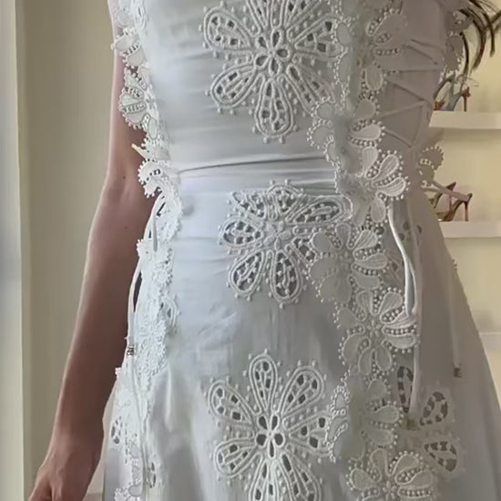 Elevate your summer wardrobe with this white sleeveless embroidered midi dress, designed for timeless elegance and effortless femininity. Featuring intricate floral embroidery on breathable fabric, a flattering high waist with adjustable lace-up sides, and a flowing A-line silhouette — this dress is your go-to for warm-weather sophistication.