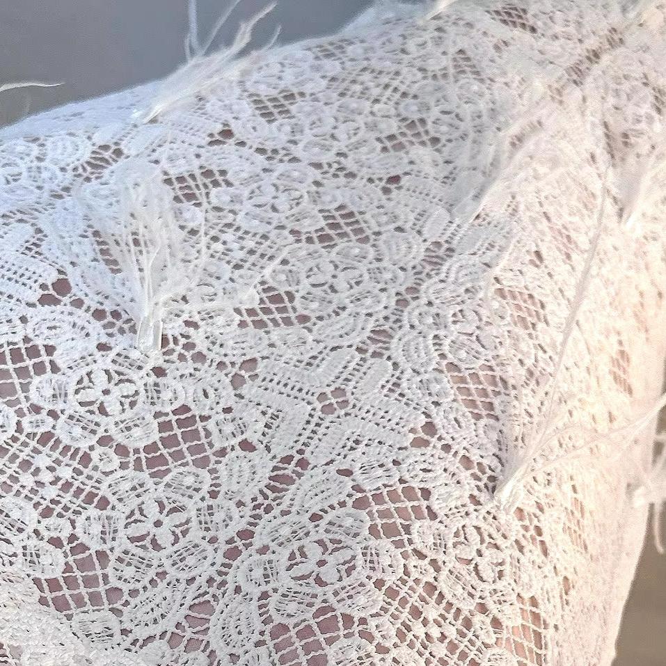 Elegantly crafted, this dress features a beautiful intricate lace design that covers the entire outfit, giving it a luxurious and sophisticated look. The dress is tailored with a fitted waistline that accentuates the figure, paired with a unique fringe detail at the hem, adding a touch of playfulness and movement to the overall aesthetic. Its final touch of elegance is highlighted by its lace fabric.