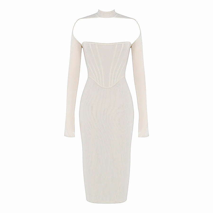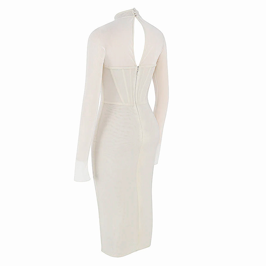 This dress in white and black colors features a corset and mesh long sleeves, making it a stylish and elegant choice for cocktails, summer parties, clubs, dinners, bridal events and graduations.