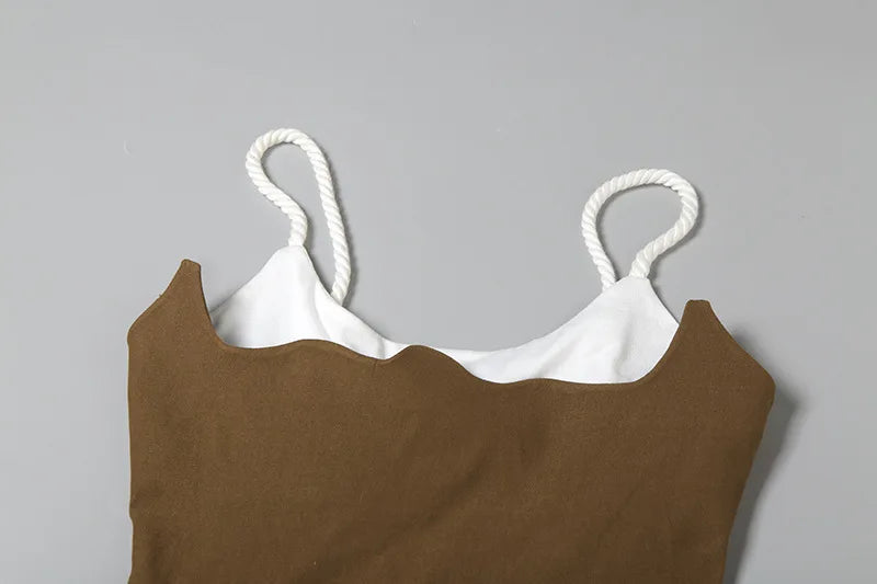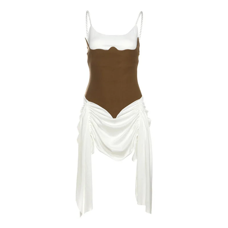 Patchwork contrast color sleeveless mesh dress for women featuring a fitted suspender silhouette, lightweight stretch fabric, and trendy feminine design. This trendy women’s dress combines a sculpting bodice with contrast color details, creating a flattering fit ideal for summer outfits, vacation wear, beach parties, and stylish daytime looks.