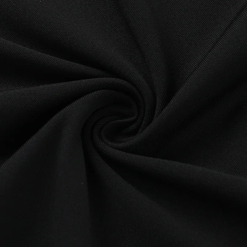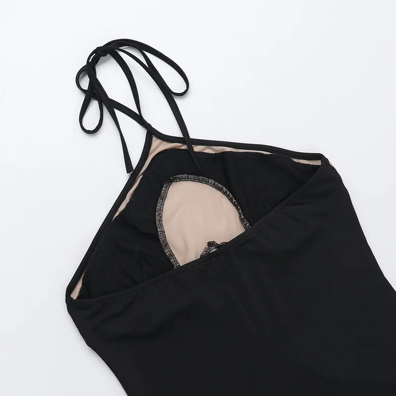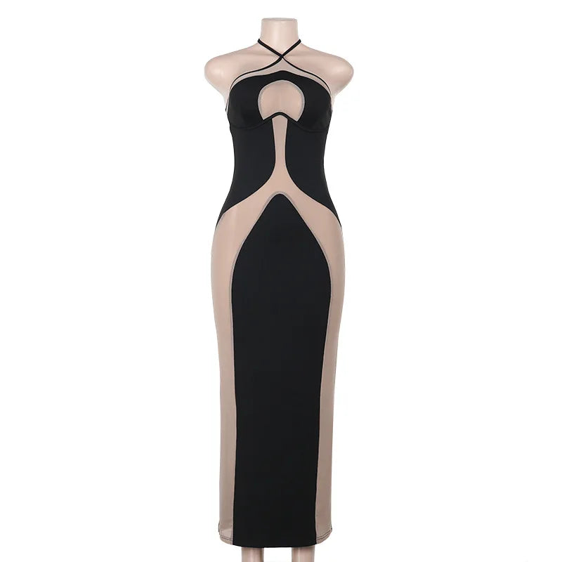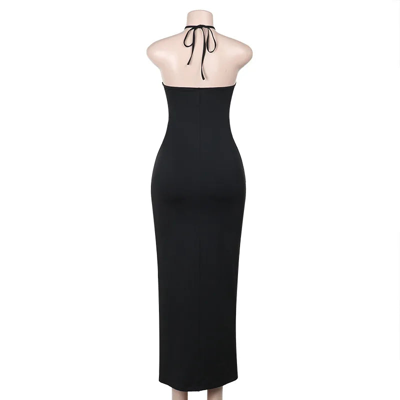 HOLLOW OUT NECK HANGING SLIT MESH BLACK MIDI DRESS