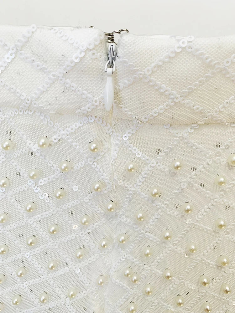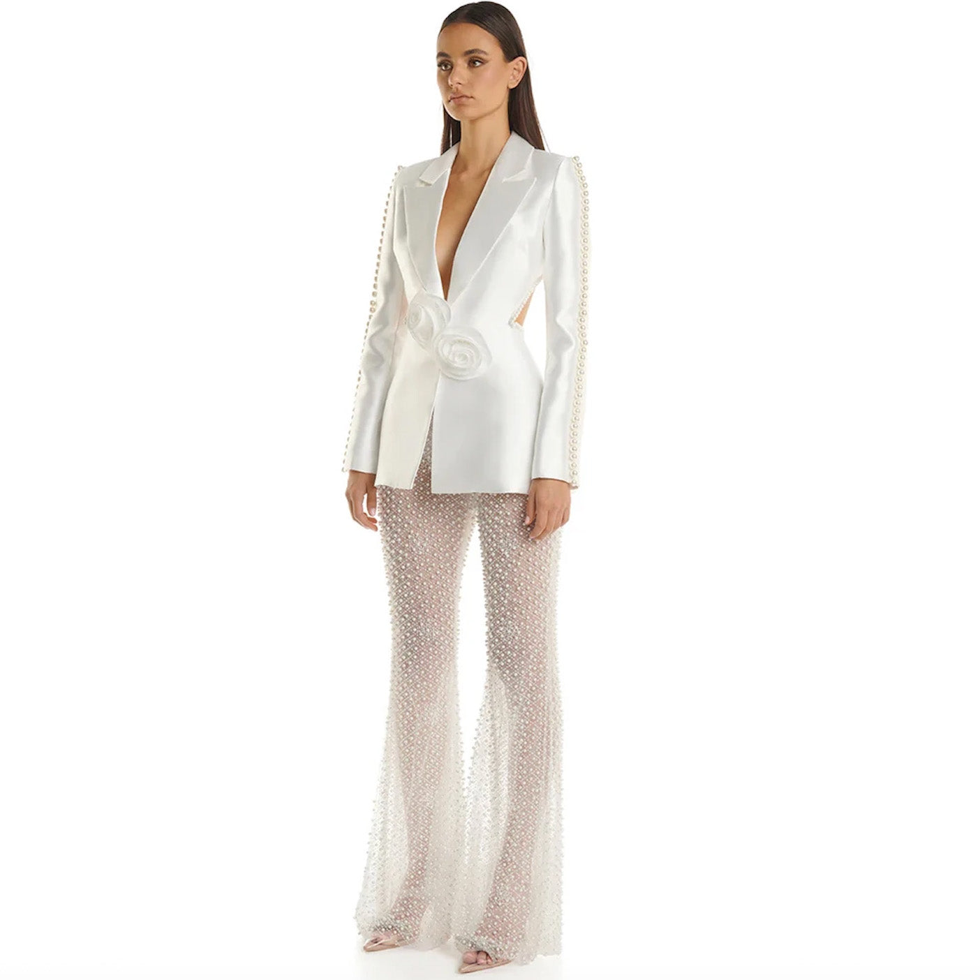 HOLLOW OUT FLOWERS APPLIQUES PEARLS BEADED BLAZER GAUZE PANTS