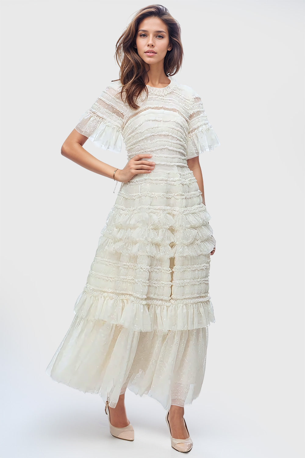 Ruffled Midi Dress with Half Sleeves - Ivory