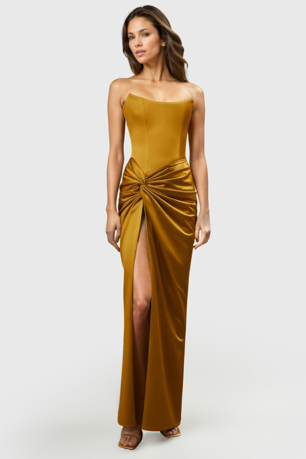 Experience elegance and sophistication with our Satined Dress with High Slit. This dress features a unique one-shoulder design and an asymmetrical neckline, adding a modern twist to a classic style. The front twist detail enhances the overall elegance of the dress, while the high slit adds a touch of allure.