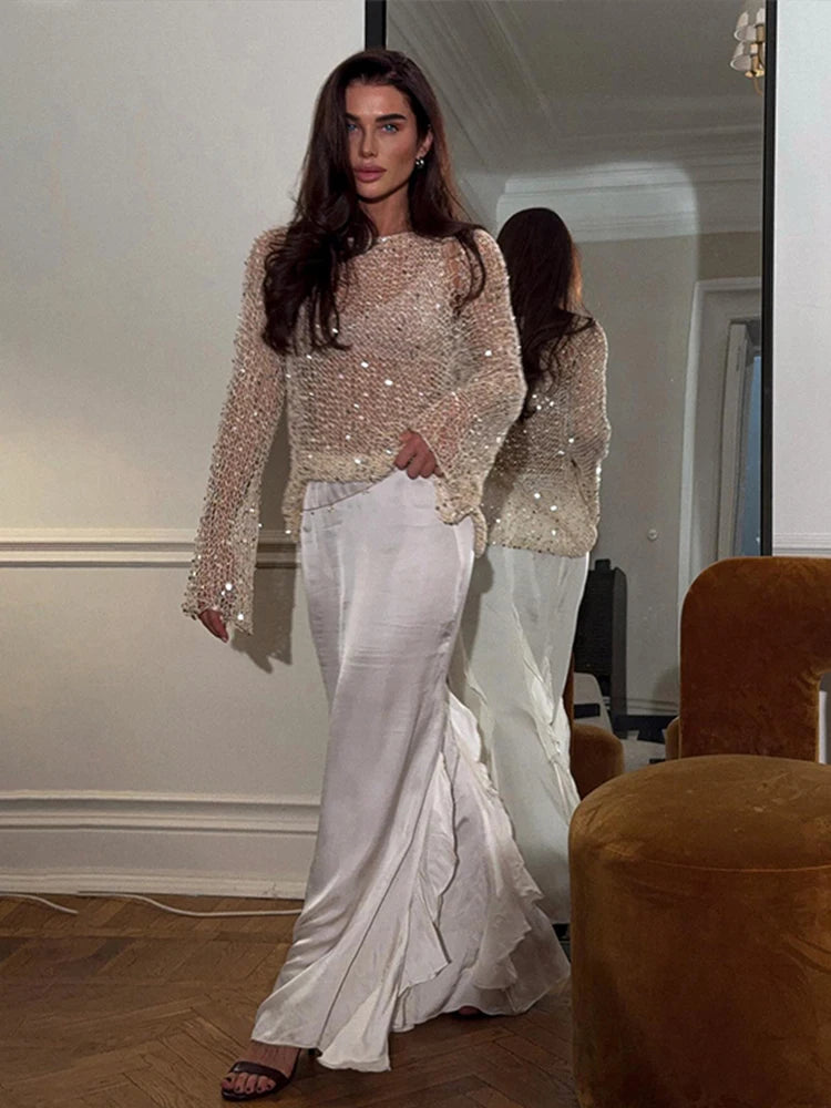 Sequin champagne knit pullover top for women with a hollow out design, long sleeves, and sparkling woven details is the ultimate statement piece for parties, nights out, and fashion-forward streetwear. This glitter blouse combines luxury knitwear with sequin shimmer, creating a socialite-inspired look perfect for holiday events, club nights, or elegant evenings. Featuring a breathable hollow out structure and relaxed fit, this knit sequin top pairs effortlessly with skirts, leather pants, or tailored trousers. Designed for trendsetters who want to shine, this champagne knit pullover is versatile enough for New Year’s Eve parties, rooftop gatherings, and upscale dinners. Elevate your wardrobe with this sparkling fashion essential that blends knitwear comfort with high-end sequin glamour.