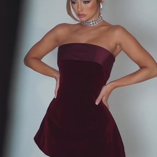 Velvet Strapless Mini Dress for Women – Backless Sexy A-line Party Outfit | Wine Red / Black
