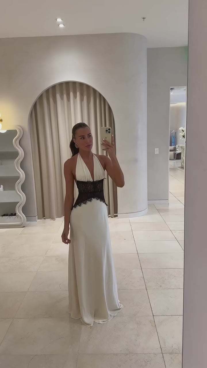 Turn heads this summer in our elegant backless halter maxi dress, crafted for women who love effortless sophistication. Featuring a deep V-neckline and intricate black lace patchwork at the waist, this sleeveless gown is designed to highlight the figure while offering comfort and style. The high waist cut elongates the silhouette, while the flowing skirt adds a touch of drama to every step. Available in white and black, it’s the perfect choice for garden parties, evening events, or summer getaways. Pair it with heels or sandals for a refined yet bold look.