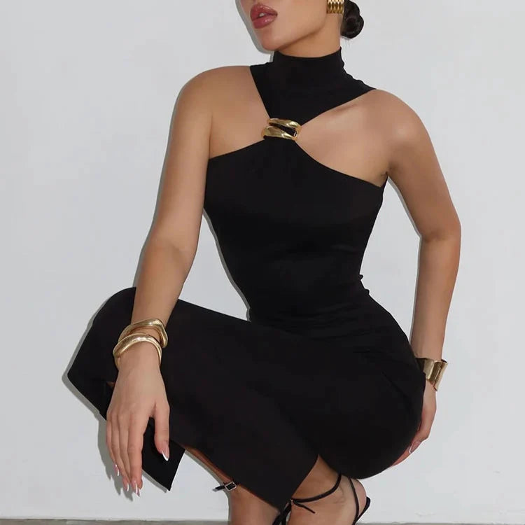 TURTLENECK OFF-SHOULDER BLACK MIDI DRESS
