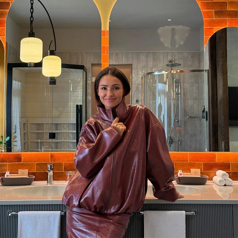 This vintage PU leather jacket and skirt set for women is the ultimate combination of timeless edge and modern sophistication. Designed for the Autumn-Winter 2025 collection, the set includes a high-neck oversized leather jacket and a slim-fit midi skirt, both crafted from soft faux leather for a structured yet comfortable silhouette. Available in green, wine red, and brown, this two-piece vegan leather outfit delivers high-end street style that transitions effortlessly from daywear to evening looks.